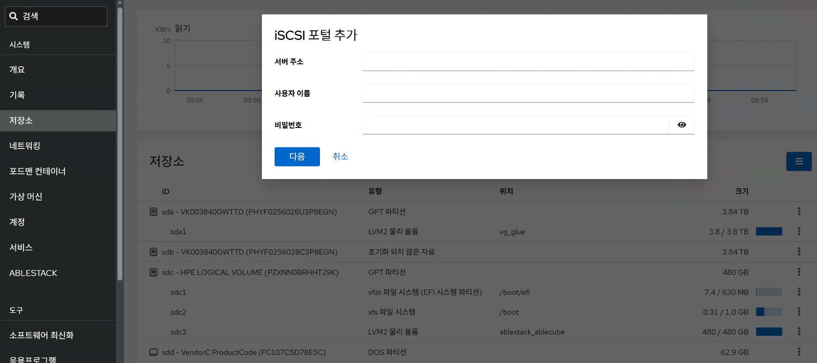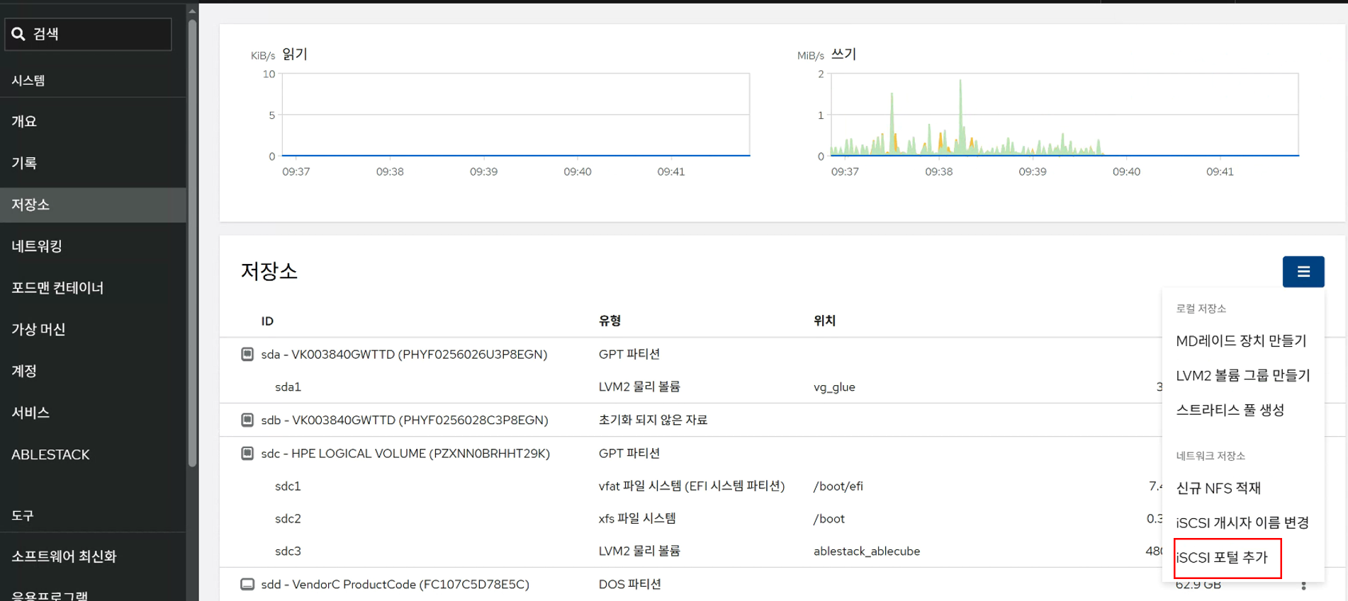 iSCSI 로 연결된 볼륨을 추가하여 스토리지로 사용할 수 있습니다.