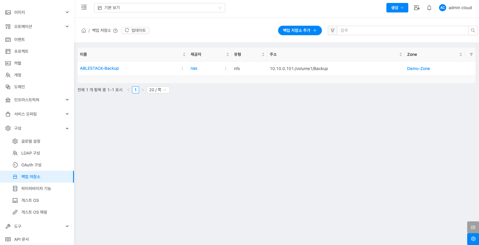 Mold의 백업 저장소(NAS)를 추가하여, 이를 통해 공유 스토리지를 KVM 호스트에 임시로 마운트하여 인스턴스 백업 /복원 디스크 작업을 수행합니다.