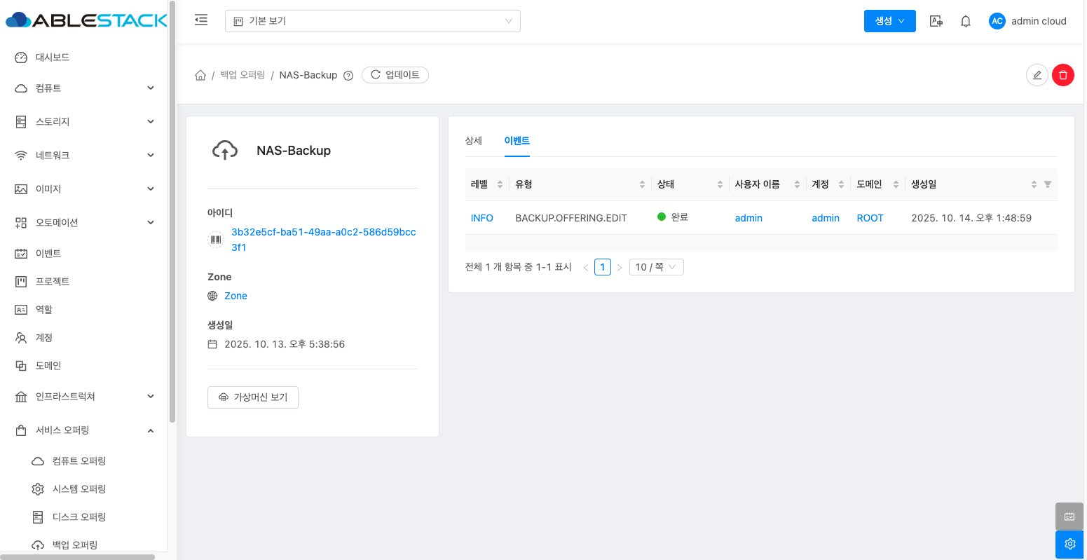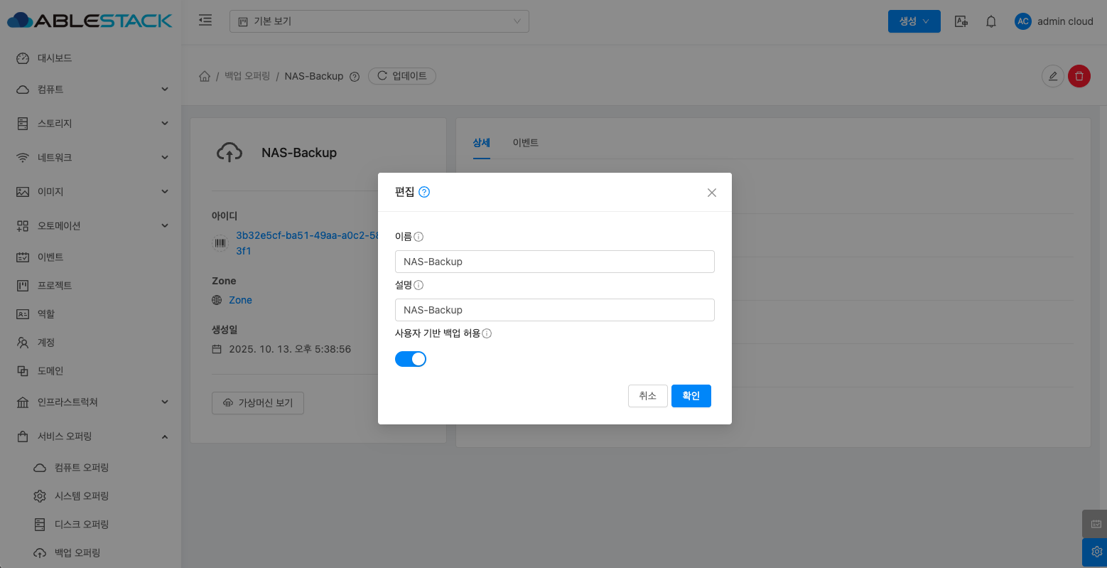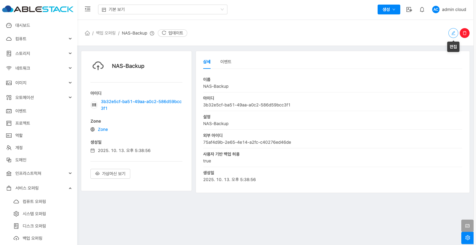 - 백업 오퍼링 상세 오른쪽 상단의 편집 버튼을 클릭합니다.