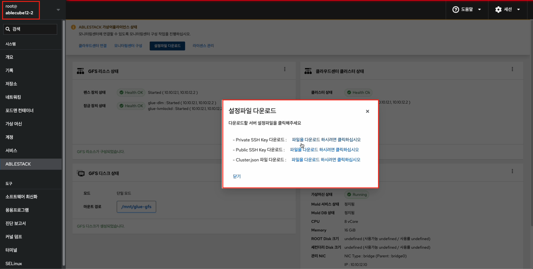 - 새로 추가하는 호스트가 아니라, 이미 클러스터링이 완료된 기존 호스트의 ABLESTACK 메뉴에서 설정파일 다운로드 를 실행하여 설정 파일을 다운로드합니다.