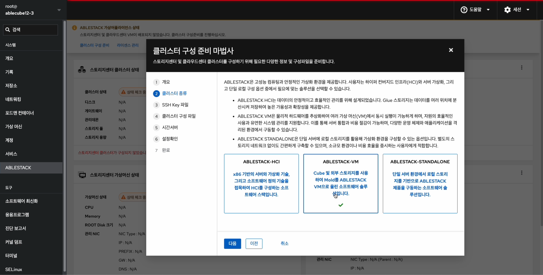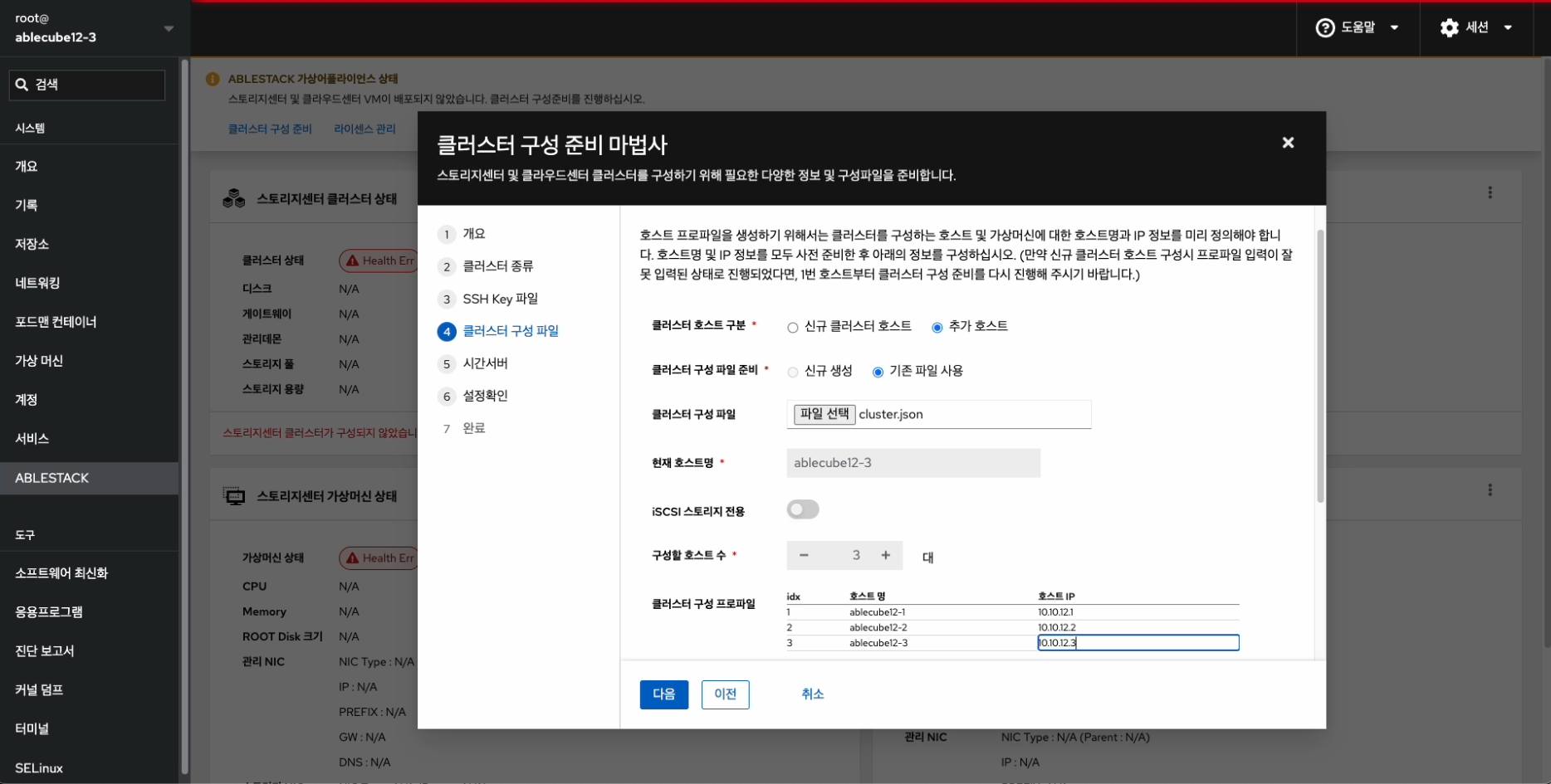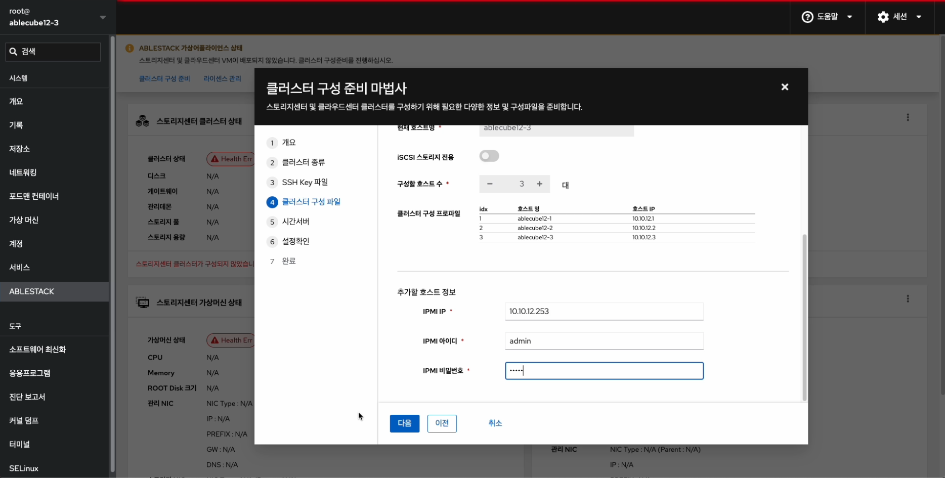 - ABLESTACK 구성을 하는데 필요한 정보를 입력 받아 클러스터 구성을 준비하는 마법사 화면입니다.