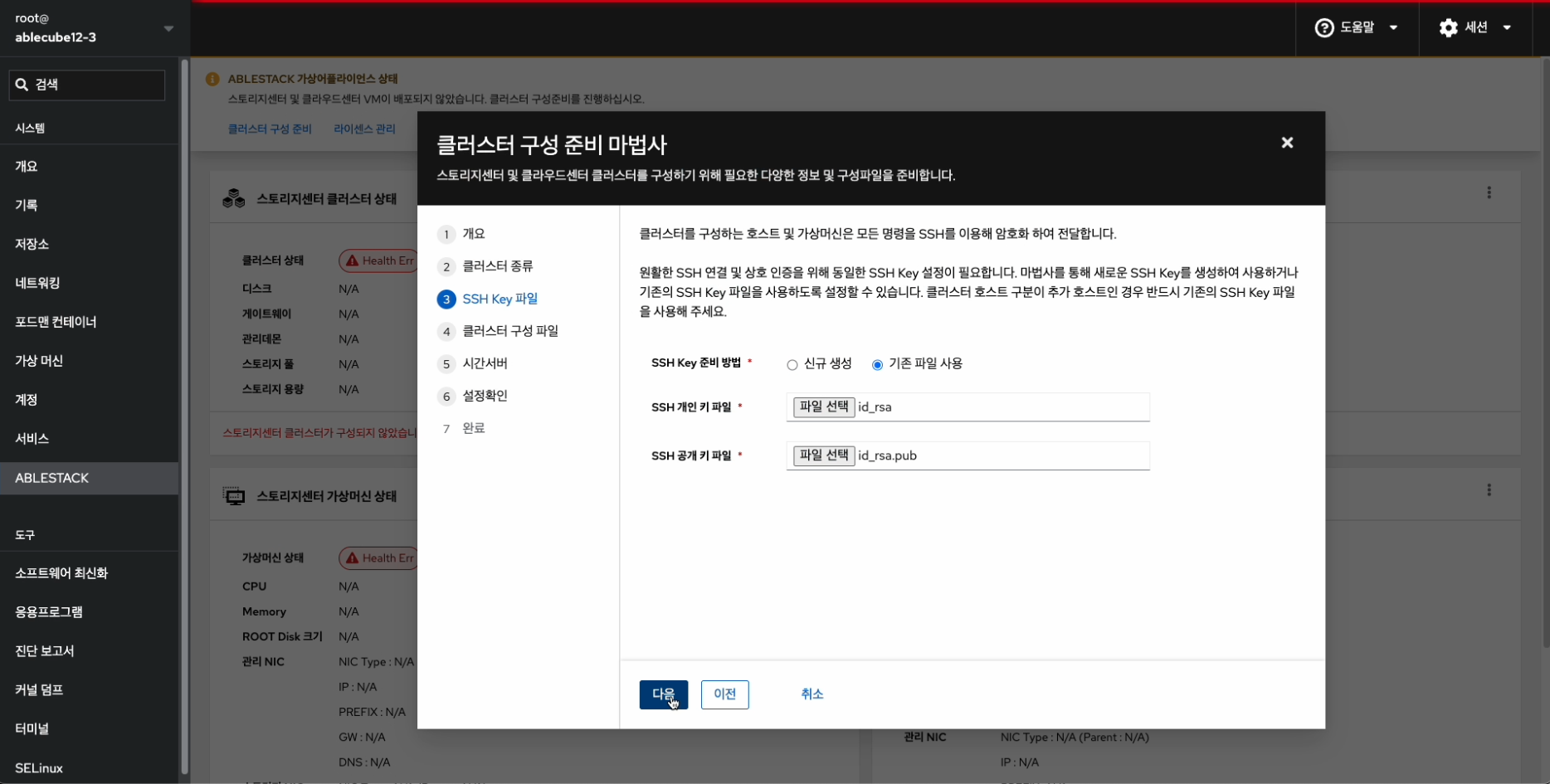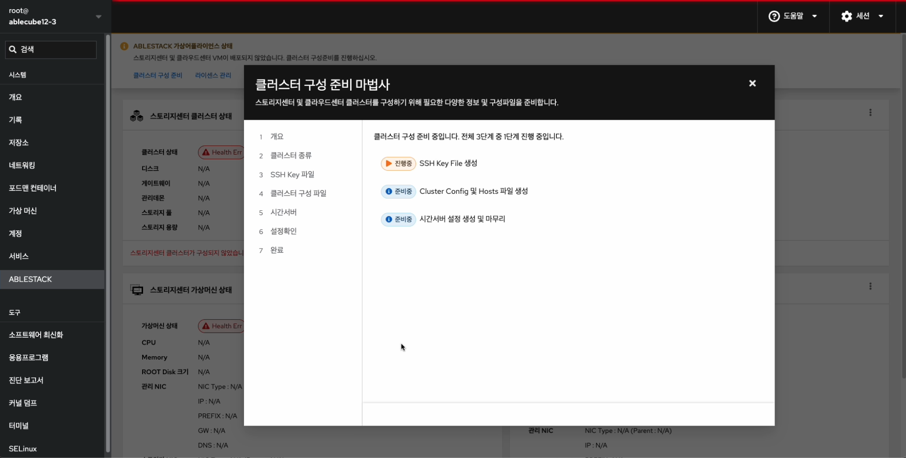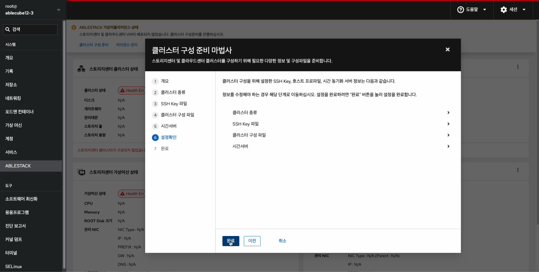 - ABLESTACK 구성을 하는데 필요한 정보를 입력 받아 클러스터 구성을 준비하는 마법사 화면입니다.