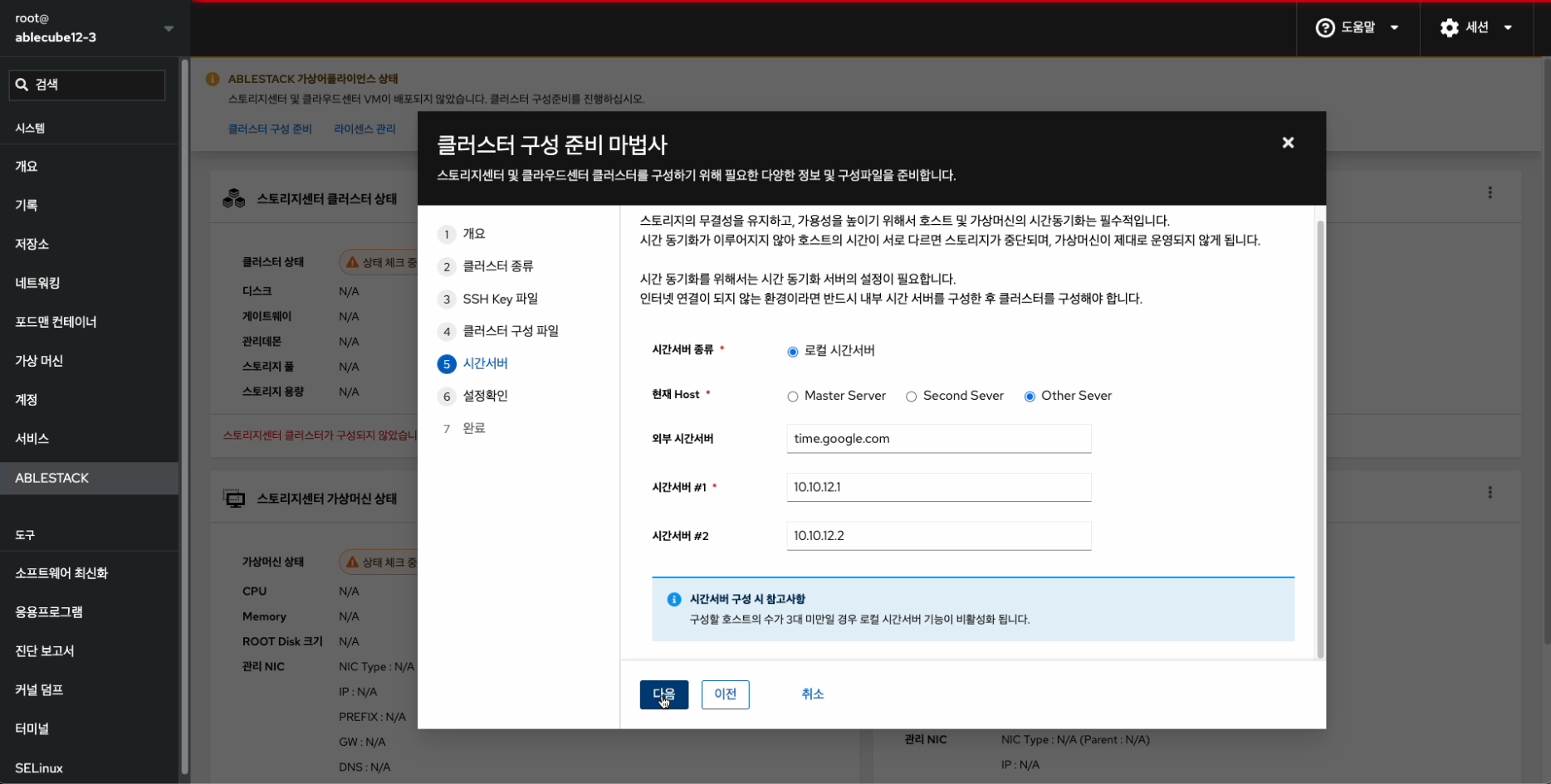 - 외부 시간 서버 및 시간서버 1 에는 1번 호스트의 Management IP, 시간서버 2 에는 2번 호스트의 Management IP 를 확인하고 다음 버튼을 클릭합니다.