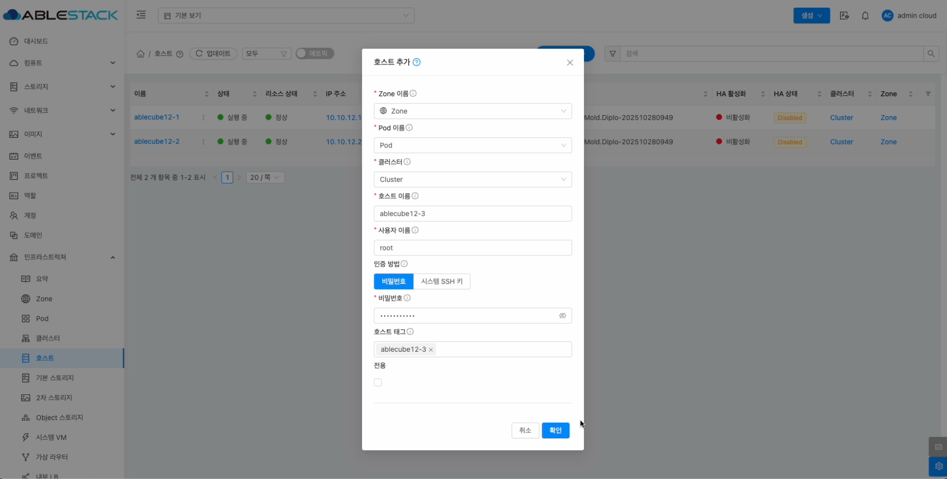 ABLESTACK Cube 호스트 추가는 기 구축된 클러스터 정보를 이용하여 추가 구축합니다.
