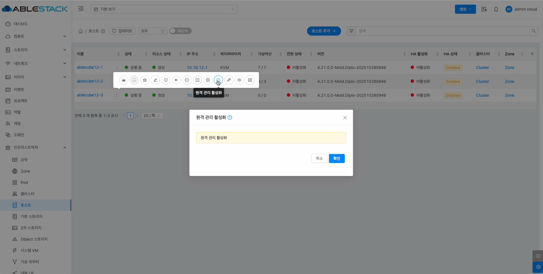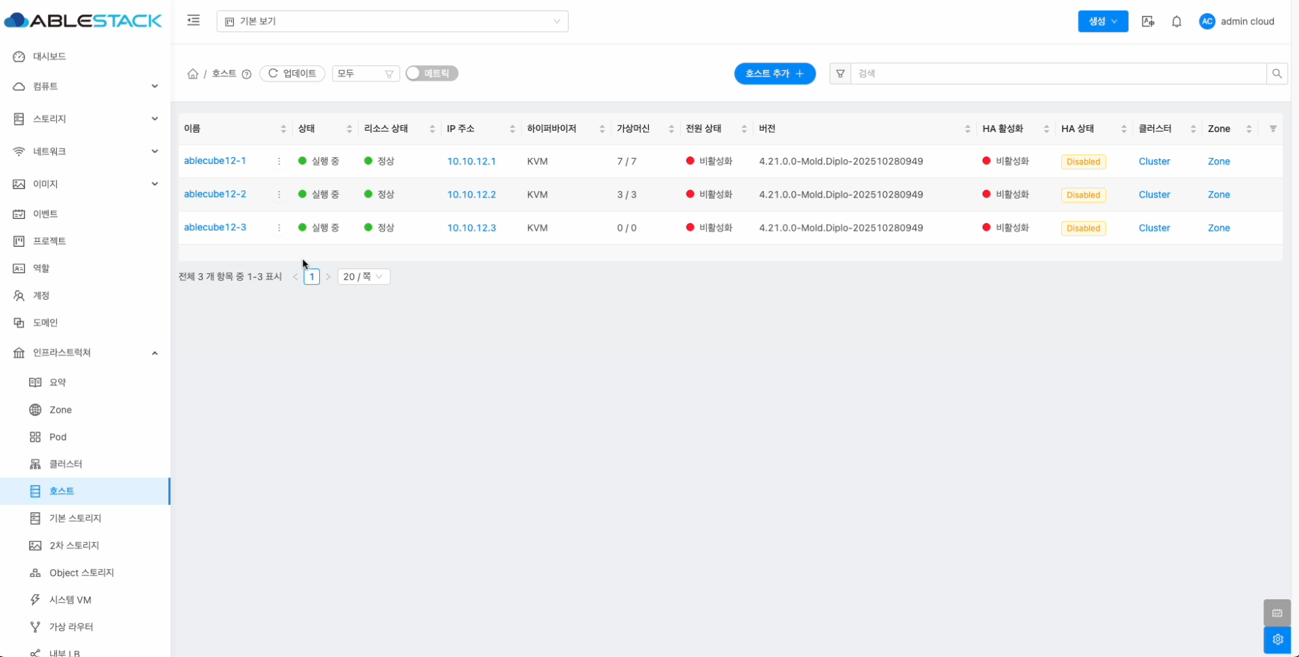 ABLESTACK Cube 호스트 추가 작업은 반드시 모든 구성요소(Cube 호스트, GFS 리소스 및 디스크 상태, 클라우드센터 가상머신)가 정상(Running) 동작 상태에서만 진행하십시오.
