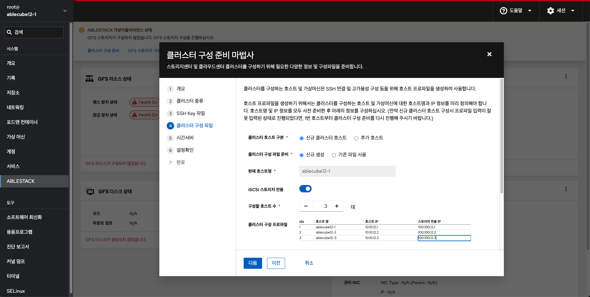 - 클러스터 구성 파일 준비 해당 호스트 파일 사용으로 자동 선택되며, ablecube 호스트 설정 정보를 자동으로 읽어와 클러스터 구성 정보 및 네트워크 IP 정보를 세팅합니다.