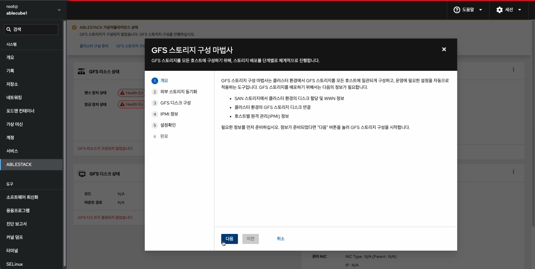 - GFS 스토리지 구성 개요 화면입니다. 개요의 내용을 확인 후 다음 버튼을 클릭합니다.