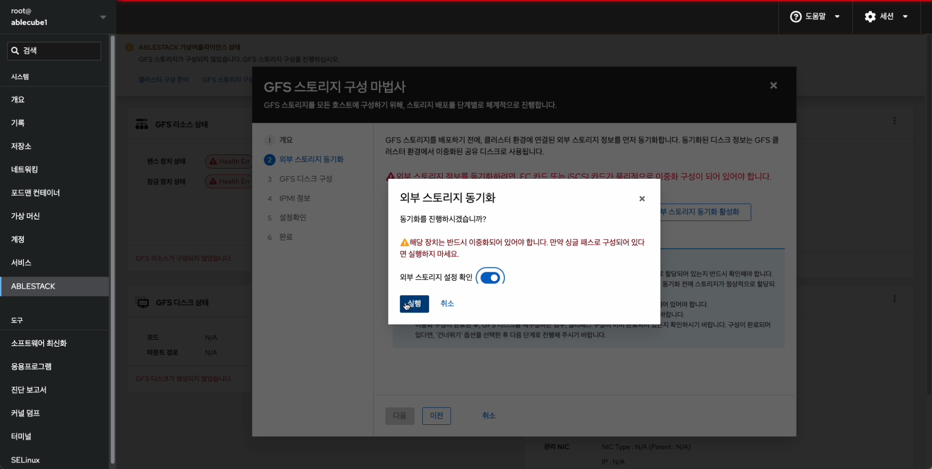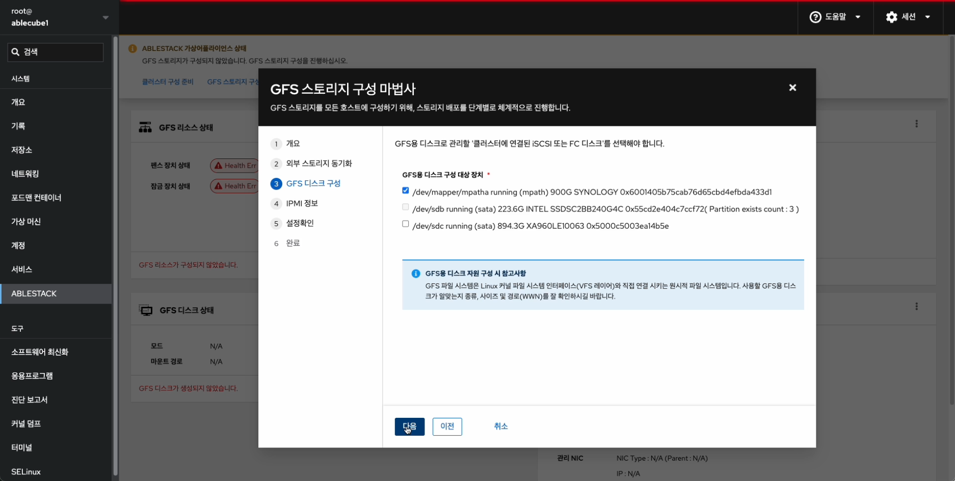 건너뛰기 - 외부 스토리지 방식(이중화 또는 단중화) 구성을 마친 뒤 GFS 대상 디스크를 잘못 선택하셨다면, 외부 스토리지 동기화 단계에서 건너뛰기를 눌러 해당 단계를 건너뛸 수 있습니다.