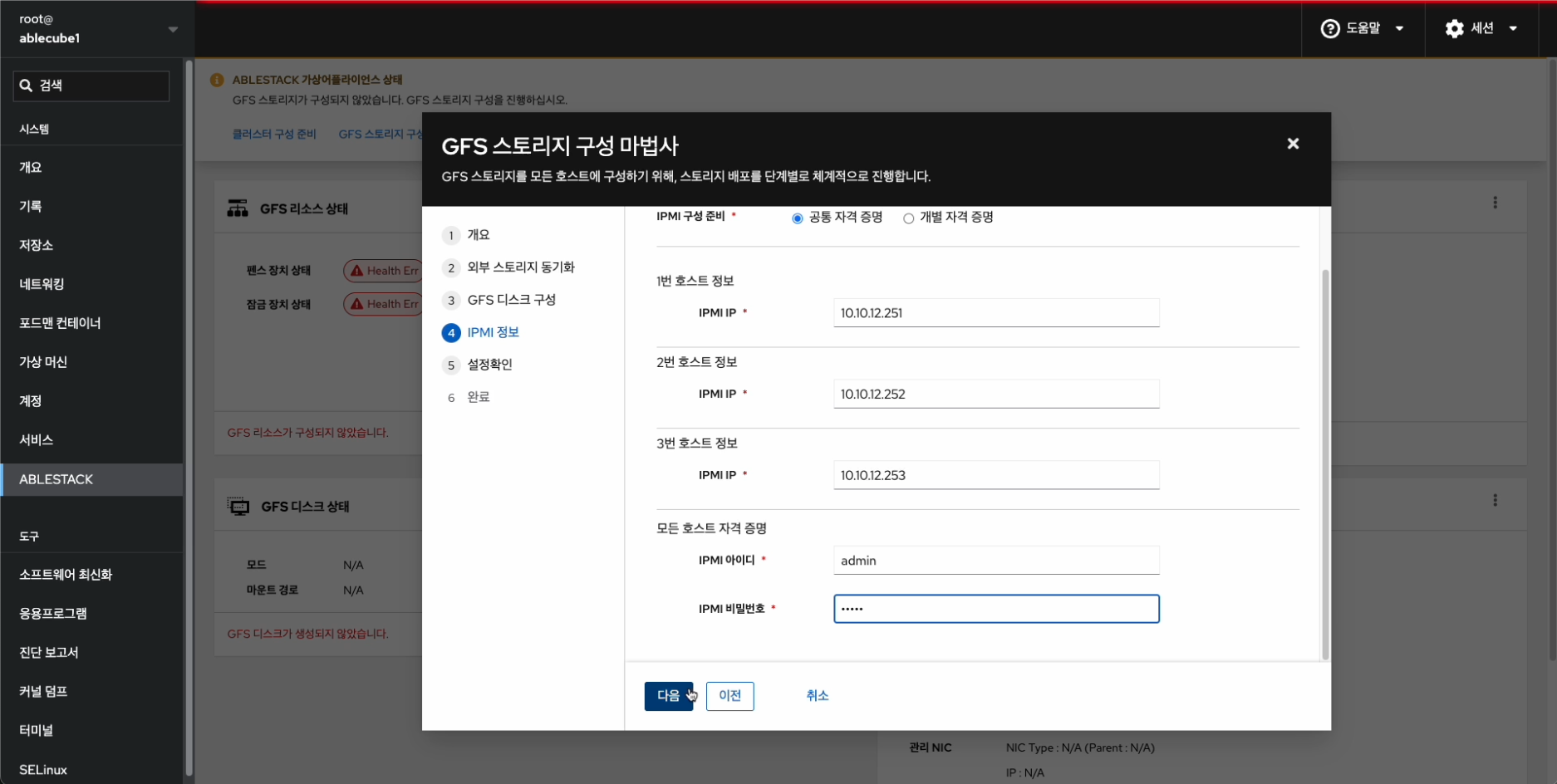 - ABLESTACK VM 구성을 하는데 필요한 정보를 입력 받아 클러스터 구성을 준비하는 마법사 화면입니다.