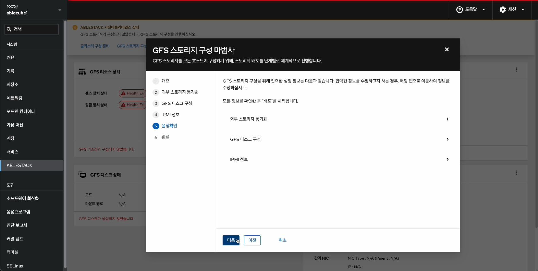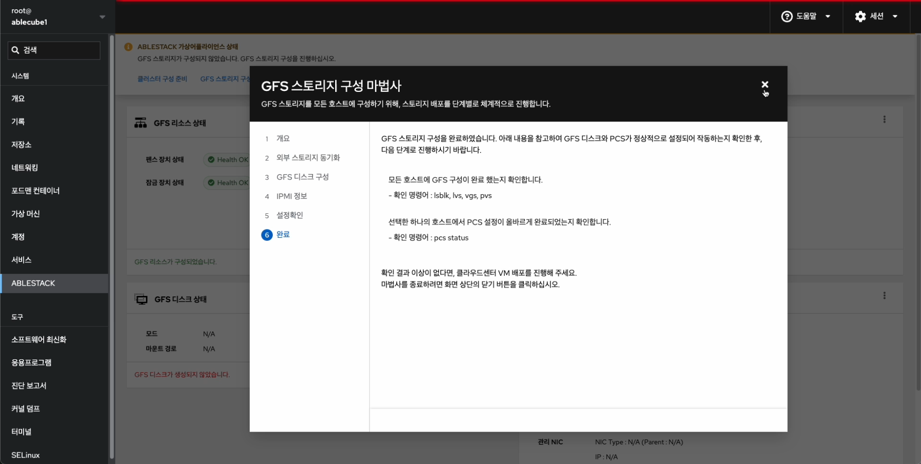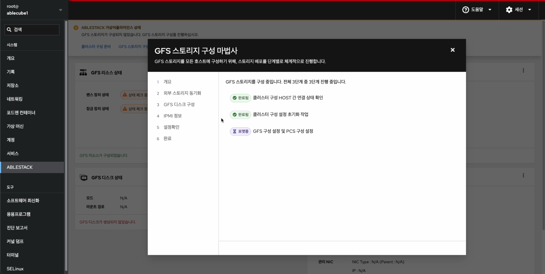 - GFS 스토리지 구성 진행상황을 확인 할 수 있는 화면입니다.